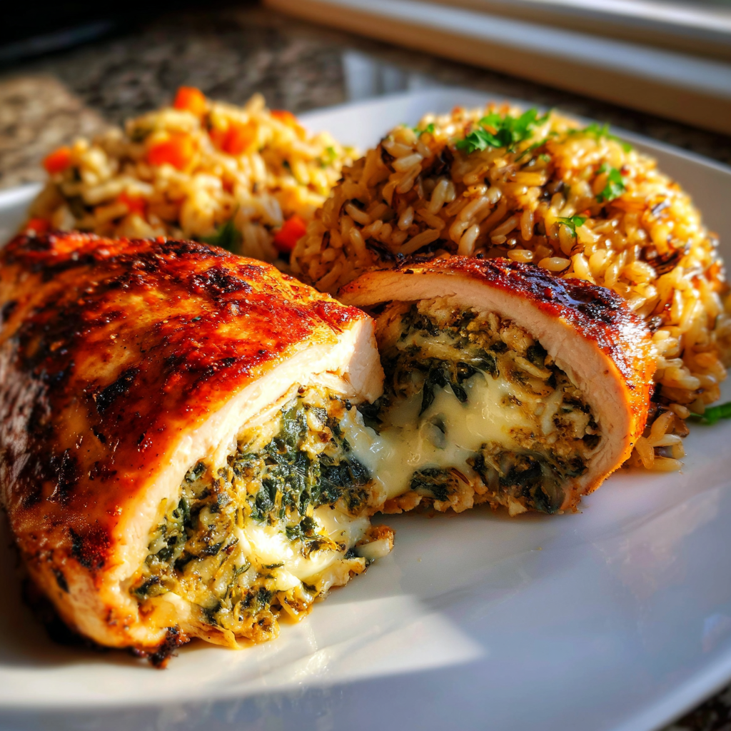The chicken breast, with its golden-brown exterior and juicy interior, is bursting with flavors from the seasoned cream cheese and sautéed spinach. Each slice reveals a beautiful contrast of colors, with the rich green of spinach contrasting against the creamy white of cheese. The wild rice pilaf, with its nutty flavor and fluffy texture, serves as the perfect accompaniment, soaking up the savory juices from the chicken. Together, they create a meal that not only satisfies your taste buds but also fills your home with warmth and comfort.